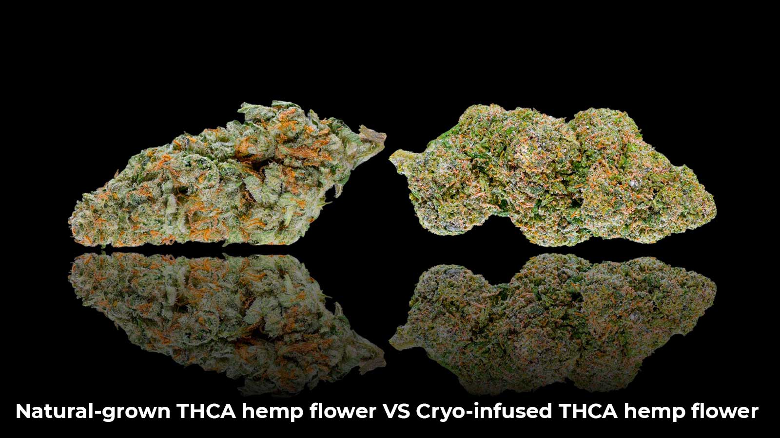 Cannabinoid distillate is first cryo-frozen at a temperature -10/-40 degrees below zero, depending on the distillate used, and then pulverized into a powder form. This process pulls out impurities, and when applied, provides an even surface spread, imbedding a trichome-like crystal dispersion deep within the flower contours that produces a natural cannabis-looking flower.